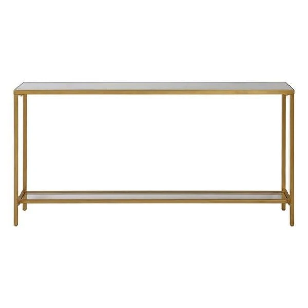 Classic And Minimalistic. This Narrow Console Table In Iron Is Finished With Lightly Antiqued Gold Leaf. Inset With Mirrored Top. And Gallery Shelf In Clear Glass. FeaturesHayley Gold Console TableSpecificationsDesigner: Grace FeyockDimension: 60 W x 30 H x 10 D in.Weight: 45 lbs