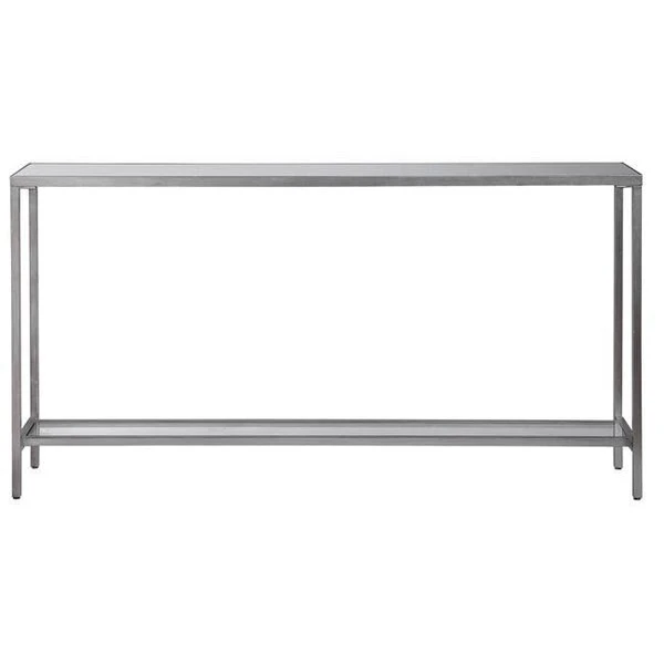Classic and Minimalistic. This Narrow Iron Console Table is Finished with Lightly Antiqued Silver Leaf. Inset with a Mirrored Top and Gallery Shelf in Clear Glass. FeaturesFurniture Combines Premium Quality Materials with Unique High-style DesignWith the advanced product engineering and packaging reinforcement. 212 Main maintains some of the lowest damage rates in the industrySpecificationsDesigner: Grace FeyockCollection: HayleyMaterial: Metal. GlassDimension: 31" H x 60" W x 10" DWeight: 47 lbs