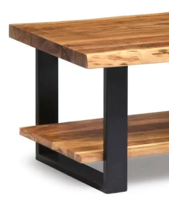 Alpine is gorgeous natural Acacia wood with live edge and metal strap legs; an industrial modern update for your living room. Each tabletop is unique; no two tops will be exactly alike. Constructed of natural acacia wood. Each of our live edge products includes nylon floor protectors. The knots and cracks add to the wood's character. A clear natural finish enhances the beautiful features in each piece of wood.