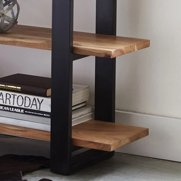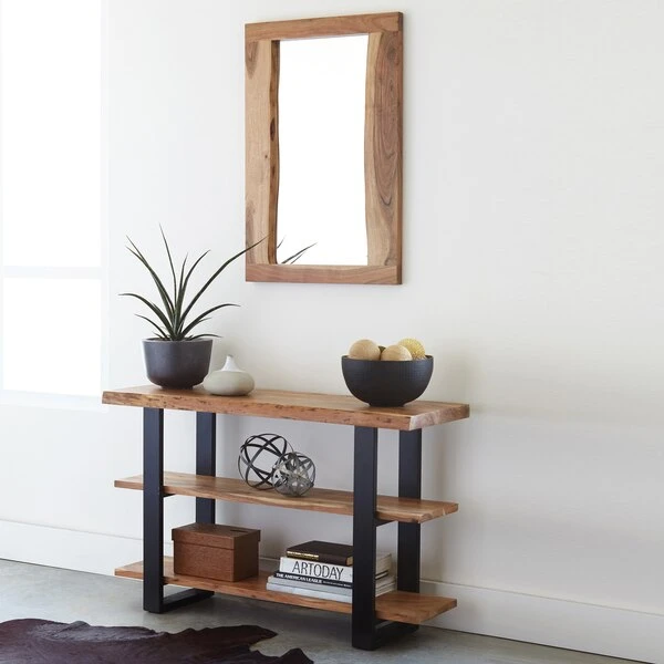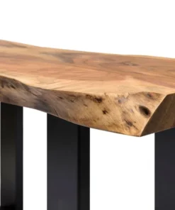 Alpine is gorgeous natural Acacia wood with live edge and metal strap legs; an industrial modern update for your living room. Each tabletop is unique; no two tops will be exactly alike. Constructed of natural acacia wood. Each of our live edge products includes nylon floor protectors. The knots and cracks add to the wood's character. A clear natural finish enhances the beautiful features in each piece of wood.