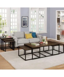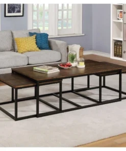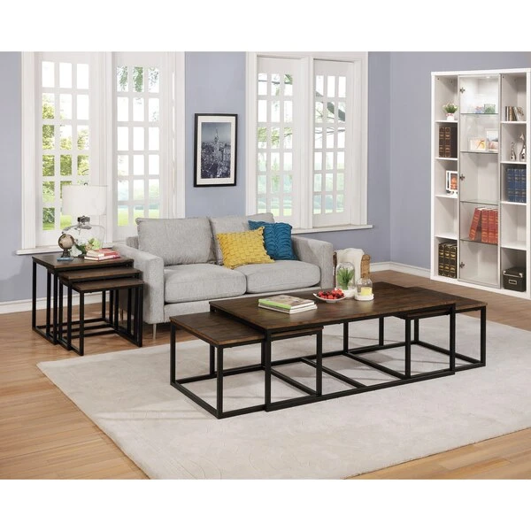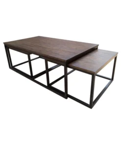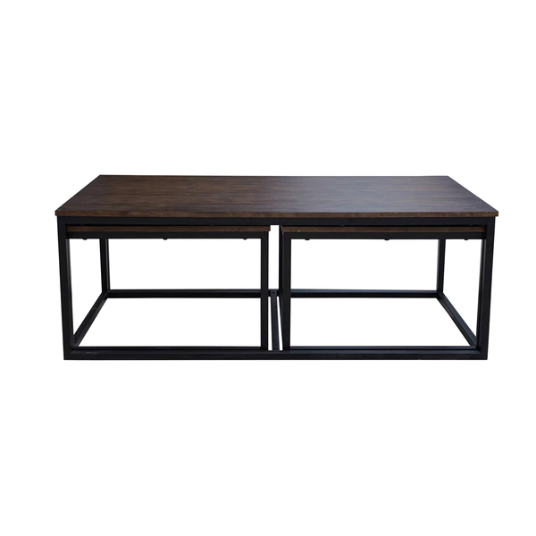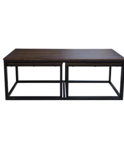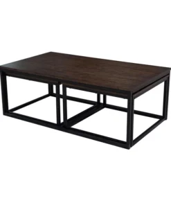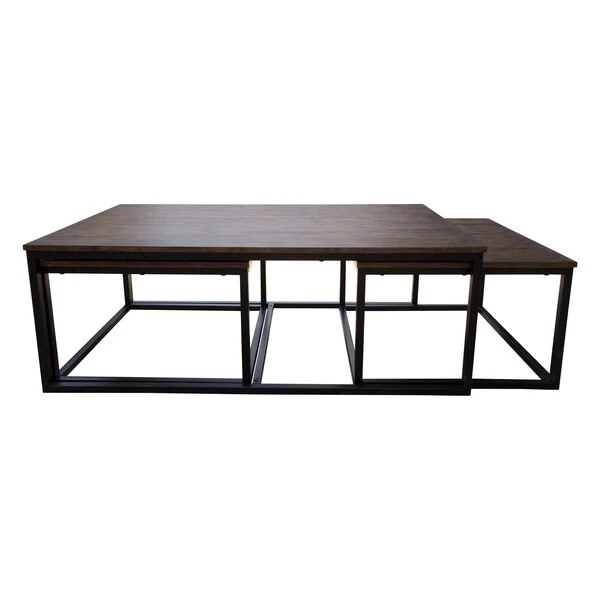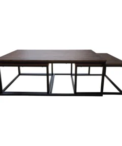 Designer, industrial style in these gorgeous dark-stained nesting tables with metal legs. Perfect for entertaining the nested tables can be used for seating or serving. The Arcadia collection features pieces that are boldly sized to make a strong statement in your living space. The metal, sled legs on each piece and dark colors create a streamlined look. These are the perfect pieces for a clean, modern space.