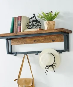 This collection of rustic wood and metal provides unpolished elegance to your space. We see this coat hook laden with your coats and scarves on its five hooks. Perhaps a small basket for mittens sits atop the shelf. Knots, cracks and even rough-hewn edges showcase the wood's original qualities. Our lacquer finish with light and dark tones allows for the wood's natural grain to show through. This collection will make a statement in your living space.