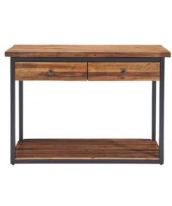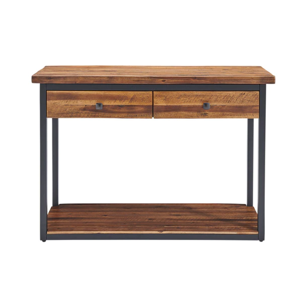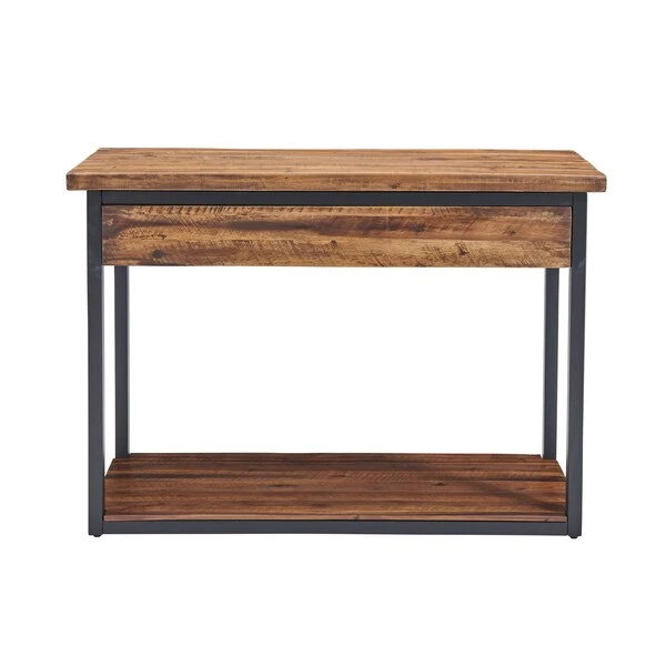 This collection of rustic wood and metal provides unpolished elegance to your space. With functional drawers and a low shelf each piece is uniquely yours. Knots, cracks and even rough-hewn edges showcase the wood's original qualities. Our lacquer finish with light and dark tones allows for the wood's natural grain to show through. This collection will make a statement in your living space.