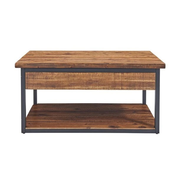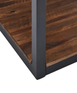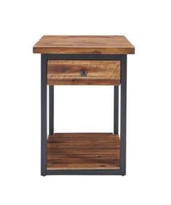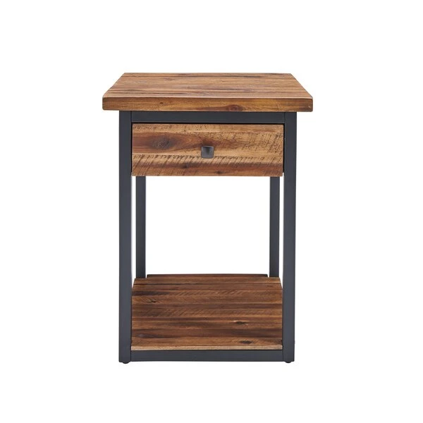 This collection of rustic wood and metal provides unpolished elegance to your space. With functional drawers and a low shelf each piece is uniquely yours. Knots, cracks and even rough-hewn edges showcase the wood's original qualities. Our lacquer finish with light and dark tones allows for the wood's natural grain to show through. This collection will make a statement in your living space.