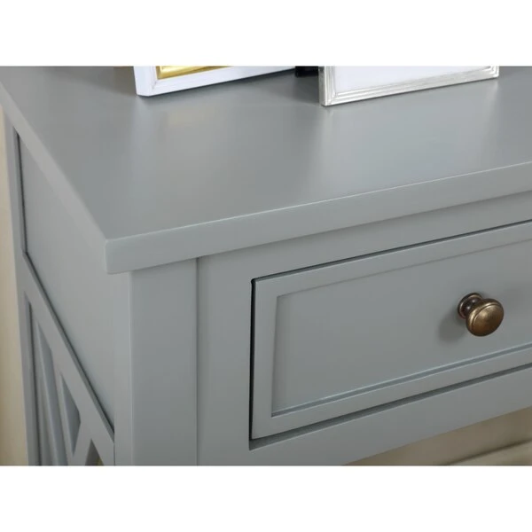 Coventry is a fresh, clean collection that is versatile in any space. The square pattern, open-detailing on each side is airy and offers a unique look for your décor. Each piece offers additional storage or display space with a shelf, drawer, or pull out tray shelf. In both dove gray and white, these pieces are the perfect compliment to your space.