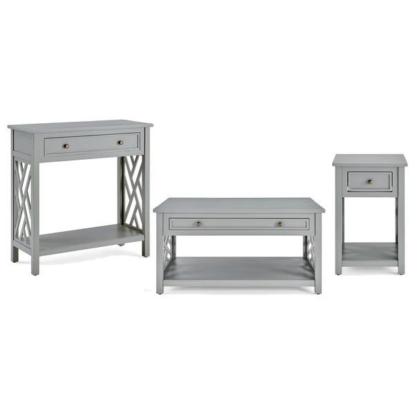 Coventry is a fresh, clean collection that is versatile in any space. The square pattern, open-detailing on each side is airy and offers a unique look for your décor. Each piece offers additional storage or display space with a shelf, drawer, or pull out tray shelf. In both dove gray and white, these pieces are the perfect compliment to your space.