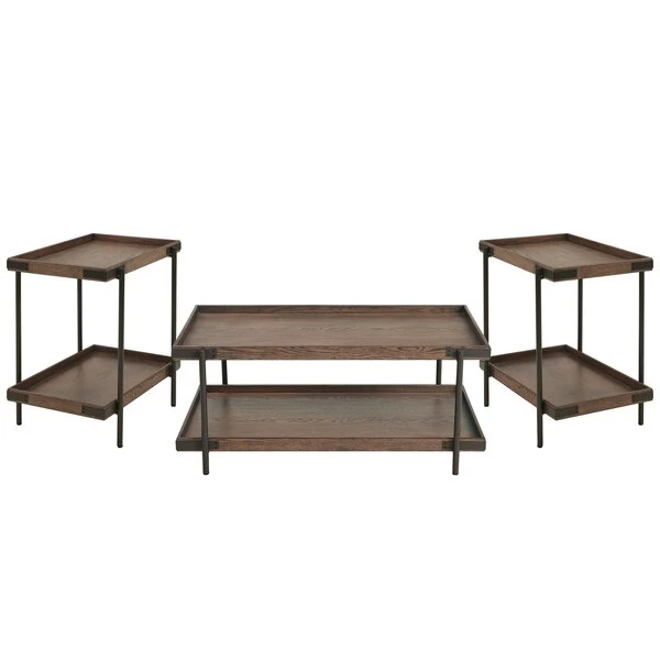 Alaterre Furniture Kyra 3-Piece Oak and Metal Living Room Set with Two 27" Side Tables and 42"L Coffee Table