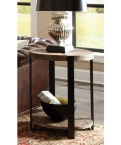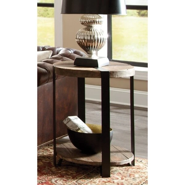 Featuring exquisite workmanship of solid wood tops with wrapped metal strap and metal legs, the Modesto collection furniture will last for years to come. The reclaimed wood finish highlights the cracks, knots, and wood grain that is unique to each piece. Modesto Round End Table fits any small space. The 20 inch diameter table offers 2 levels of pure beauty. Place your favorite lamp on top and add a vase, plant, or books on the lower shelf to complete this beautiful design.
