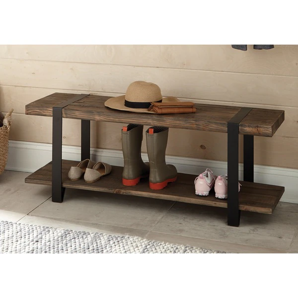 Featuring exquisite workmanship of solid wood tops with wrapped metal strap and metal legs, the Modesto collection furniture will last for years to come. The reclaimed wood finish highlights the cracks, knots, and wood grain that is unique to each piece. Modesto reclaimed wood bench is versatile and perfect for your entryway, dining, or living room. Sit on the bench to put on or remove your shoes. Metal strap wraps over the top of the bench and is level for sitting.