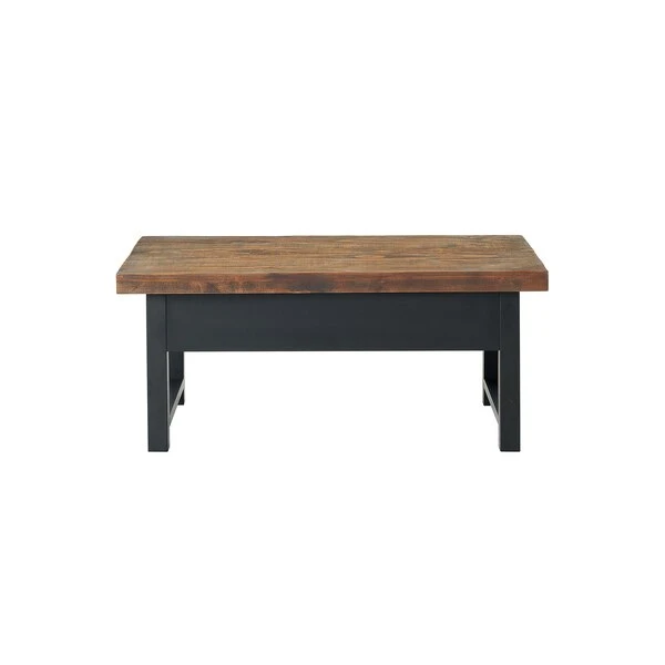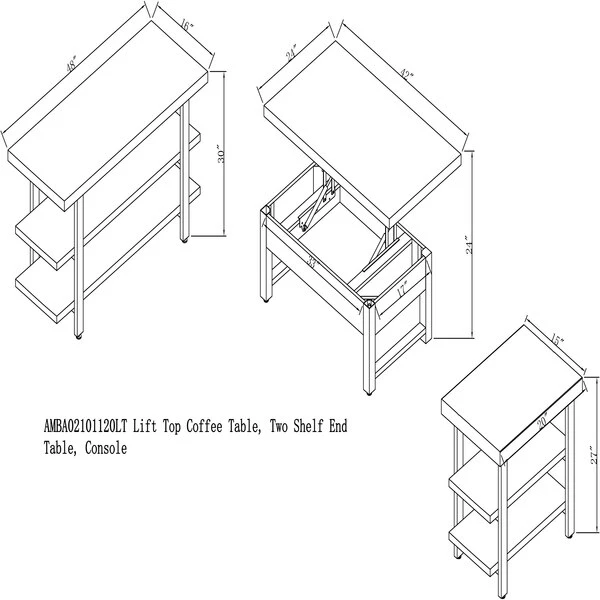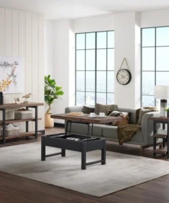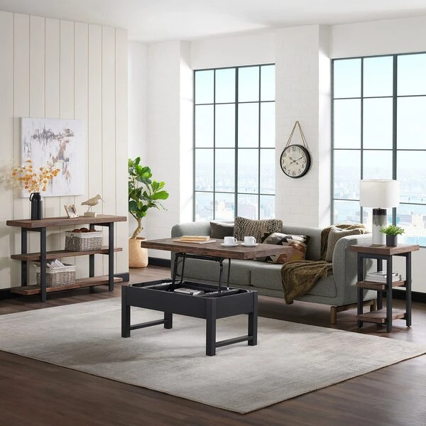 The Pomona collection features the exquisite workmanship of a solid wood top with metal legs that will last for years to come. Each piece is constructed of solid pine wood and finished to have the appearance of reclaimed wood. The reclaimed wood finish highlights natural wood variations such as cracks and knots which add to the piece's character. This set of four is sure to enhance your living room style; one lift top coffee table, sofa/TV console and two end tables complete the look. Any item in this collection will add to the rustic industrial style of any space.