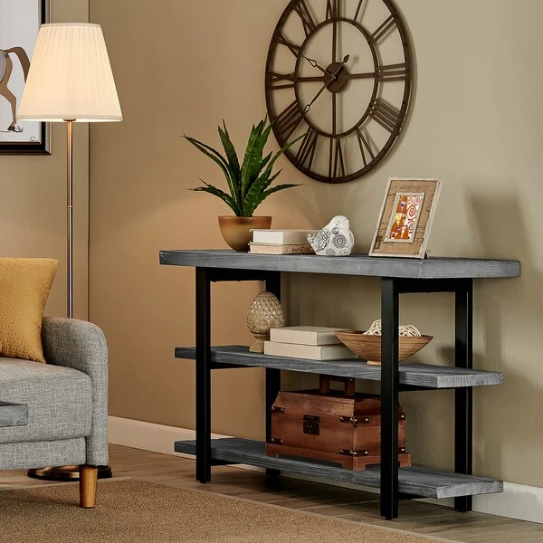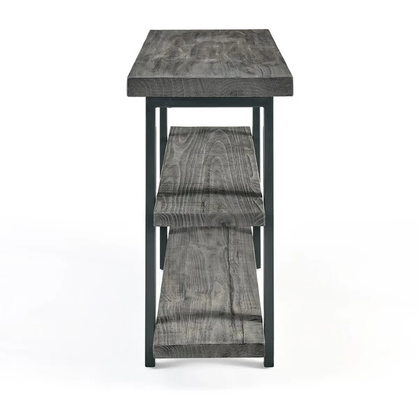 The Pomona collection features the exquisite workmanship of a solid wood top with metal legs that will last for years to come. Each piece is constructed of solid pine wood and finished to have the appearance of reclaimed wood. The reclaimed wood finish highlights natural wood variations such as cracks and knots which add to the piece's character. Any item in this collection will add to the rustic industrial style of any space. Pomona Media/Console table is versatile for any space. Crafted for both large and small areas, this sturdy design will keep you organized or showcase your 40" television in a sleek profile.