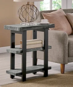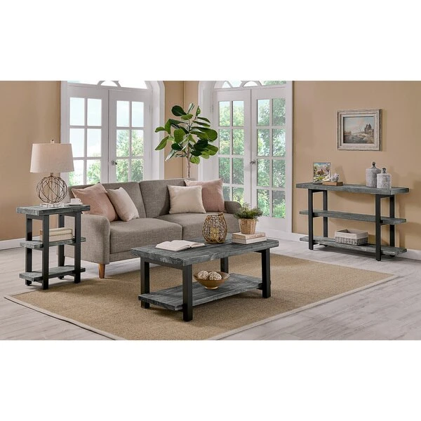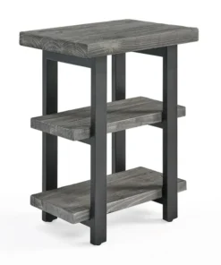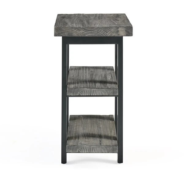 The Pomona collection features the exquisite workmanship of a solid wood top with metal legs that will last for years to come. Each piece is constructed of solid pine wood and finished to have the appearance of reclaimed wood. The reclaimed wood finish highlights natural wood variations such as cracks and knots which add to the piece's character. Any item in this collection will add to the rustic industrial style of any space. The Pomona collection features the exquisite workmanship of a solid wood top with metal legs that will last for years to come. Each piece is constructed of solid pine wood and finished to have the appearance of reclaimed wood. The reclaimed wood finish highlights natural wood variations such as cracks and knots which add to the piece's character. Any item in this collection will add to the rustic industrial style of any space. Pomona 2-Shelf End Table will add warmth to any décor. The Slate Gray finish and design provide a stylish element to your room. Add your favorite lamp, books, magazines, or knick knack to complete your decorating style.