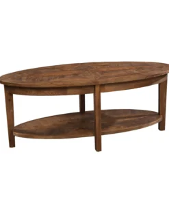Revive Collection of reclaimed wood furniture features handcrafted design and a reduced impact on the environment. Reclaimed wood wears its history proudly and is long lasting. The lacquer finish allows each piece to show its natural wood knots, cracks, and grain. Beautiful detailing in the wood is a surprising feature. This large oval coffee table features one lower shelf for additional storage or display space.
