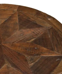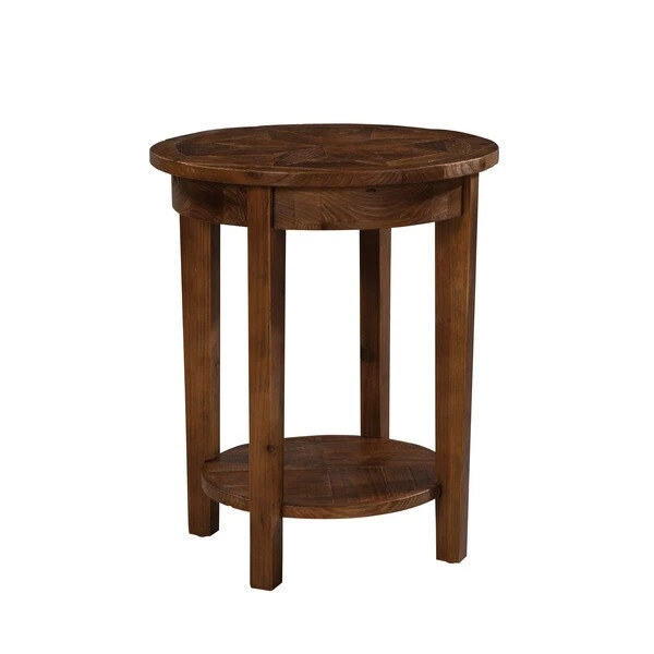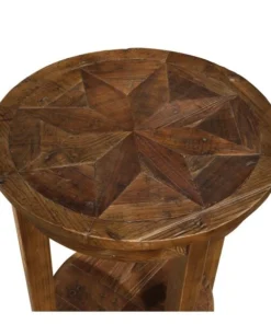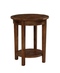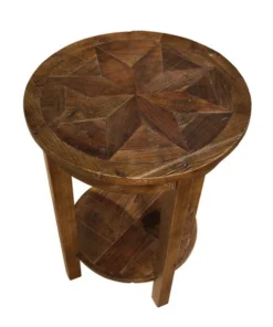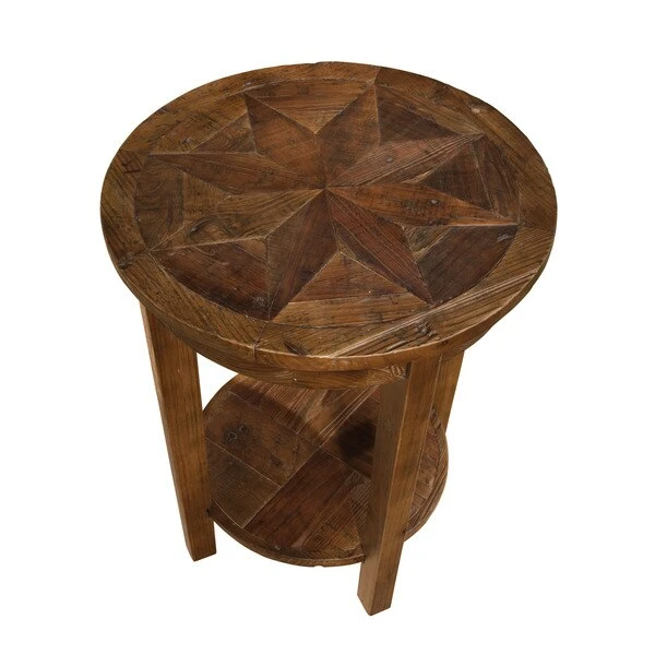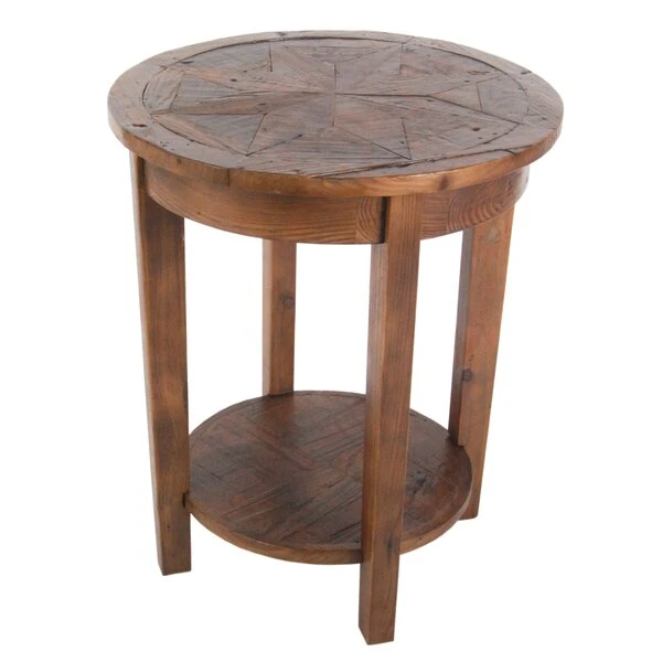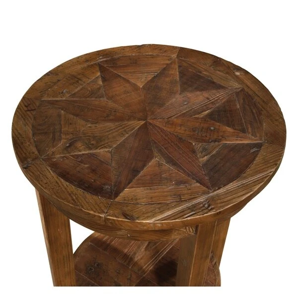 Revive Collection of reclaimed wood furniture features handcrafted design and a reduced impact on the environment. Reclaimed wood wears its history proudly and is long lasting. The lacquer finish allows each piece to show its natural wood knots, cracks, and grain. Beautiful detailing in the wood is a surprising feature. This round end table features one lower shelf for additional storage or display space.