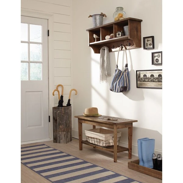Revive Collection of reclaimed wood furniture features handcrafted design and a reduced impact on the environment. Reclaimed wood wears its history proudly and is long lasting. The lacquer finish allows each piece to show its natural wood knots, cracks, and grain. Beautiful detailing in the wood is a surprising feature. This bench and coat hook set is the perfect addition to any entryway, mud room, or hall. Four double, metal coat hooks and three large cubbies combine to provide ample storage. While the bench is sturdy and also provides shelf storage.
