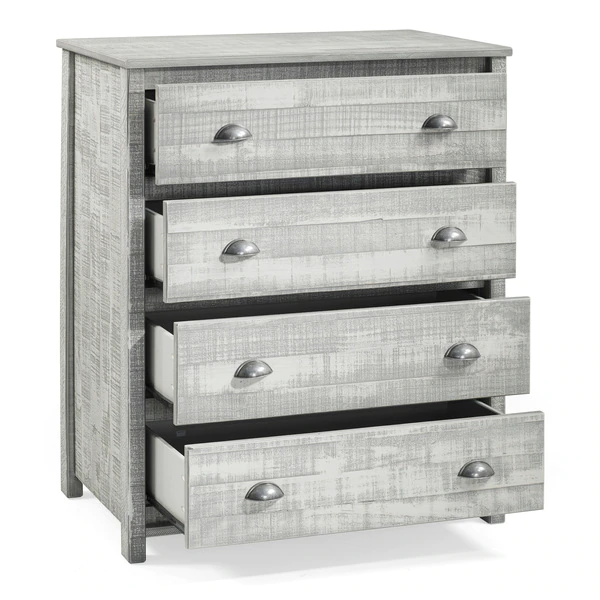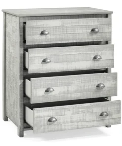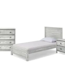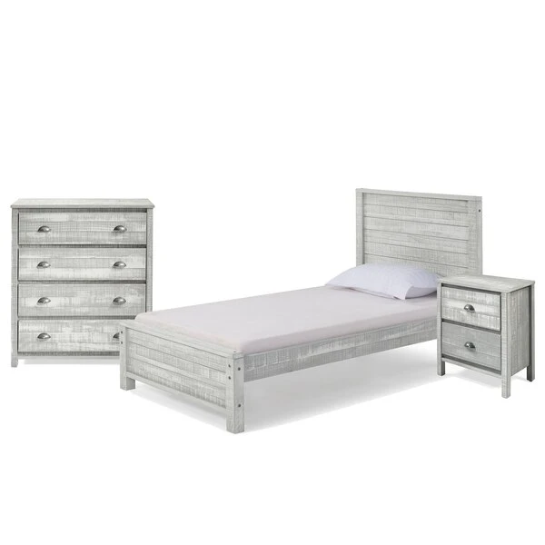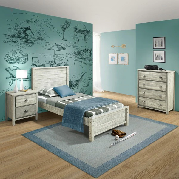 Rustic-style for your child's room, guest room or any smaller bedroom space. Offered in rustic gray or rustic white this well-made Brazilian Pine furniture sets the tone for your farmhouse or shabby chic style. The panel headboard features clean lines that continue through the rest of the set. Each set includes a 4 drawer vertical dresser, a nightstand, and a twin bed frame.