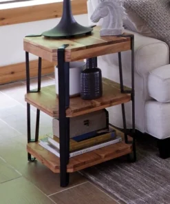 Industrial-styled Ryegate features solid wood tops with wood veneers. These tables make a strong industrial modern statement in your living space. Each tabletop is unique; no two tops will be exactly alike. Constructed of natural acacia wood. Each of our live edge products includes nylon floor protectors. The knots and cracks add to the wood's character. A clear natural finish enhances the beautiful features in each piece of wood.
