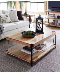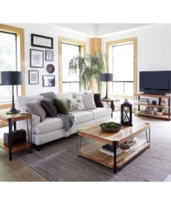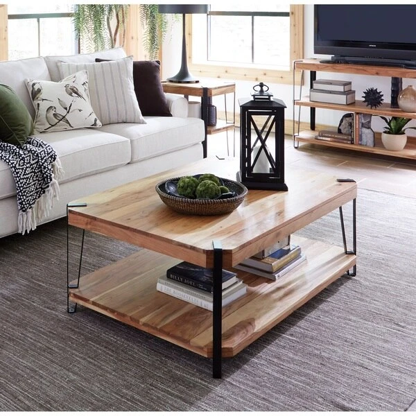 Industrial-styled Ryegate features solid wood tops with wood veneers. These tables make a strong industrial modern statement in your living space. Each tabletop is unique; no two tops will be exactly alike. Constructed of natural acacia wood. Each of our live edge products includes nylon floor protectors. The knots and cracks add to the wood's character. A clear natural finish enhances the beautiful features in each piece of wood.