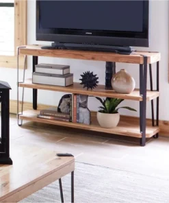 Industrial-styled Ryegate features solid wood tops with wood veneers. These tables make a strong industrial modern statement in your living space. Each tabletop is unique; no two tops will be exactly alike. Constructed of natural acacia wood. Each of our live edge products includes nylon floor protectors. The knots and cracks add to the wood's character. A clear natural finish enhances the beautiful features in each piece of wood.