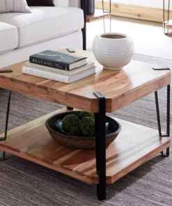 Industrial-styled Ryegate features solid wood tops with wood veneers. These tables make a strong industrial modern statement in your living space. Each tabletop is unique; no two tops will be exactly alike. Constructed of natural acacia wood. Each of our live edge products includes nylon floor protectors. The knots and cracks add to the wood's character. A clear natural finish enhances the beautiful features in each piece of wood.