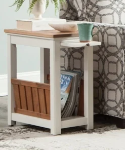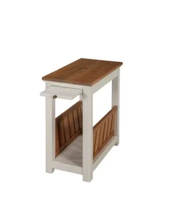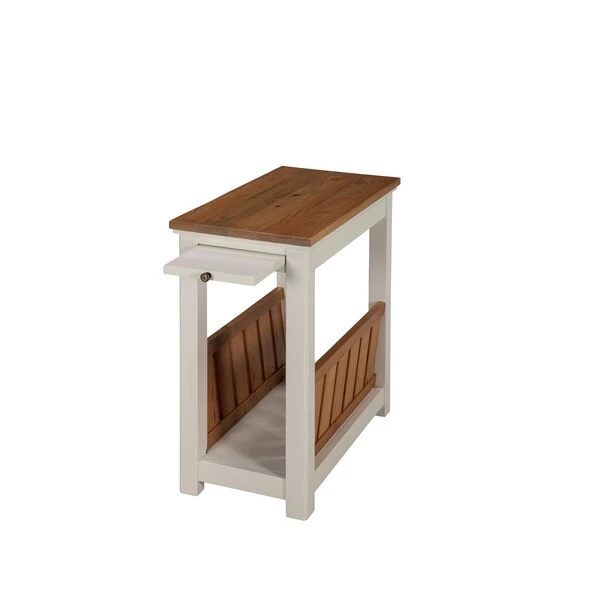 Savannah collection offers modern cottage styling; with its wood top and white painted legs it offers fresh style to your living space. Savannah includes end tables, console tables and media/storage pieces. You can design the perfect living room for your home. This narrow end table features a pull out tray shelf and magazine rack for additional storage or display space. The pine construction makes this piece sturdy and durable.