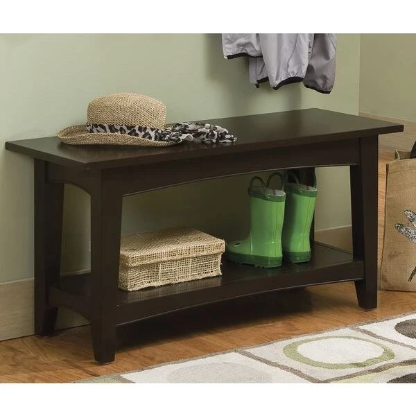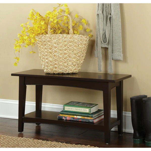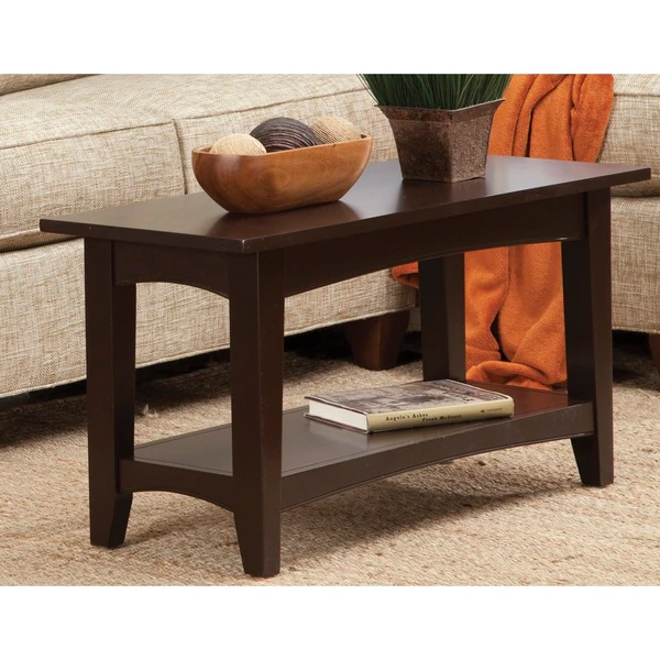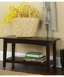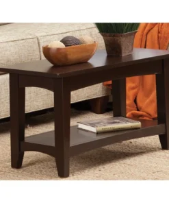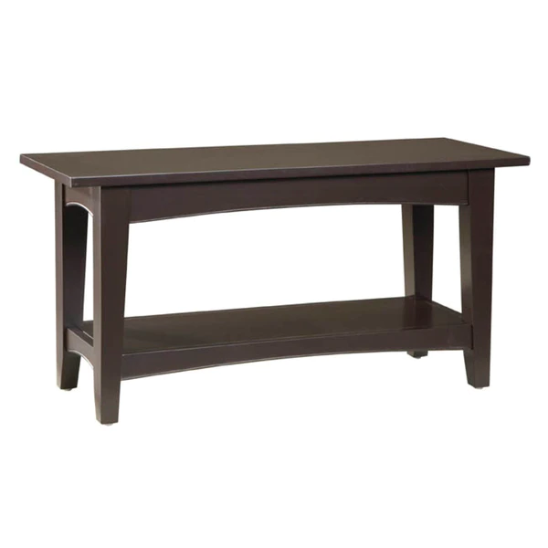 The Shaker Cottage collection will compliment any décor. Transitional, cottage styling in multiple finish choices will blend into many spaces. Each piece offers both style and storage to help update a room. This bench can be used as a coffee table, in the mudroom as a bench for shoes or in any lifestyle setting. This unit is easy to assemble and sturdy. It includes a lower shelf for storage. Made from wood with a chocolate brown finish.
