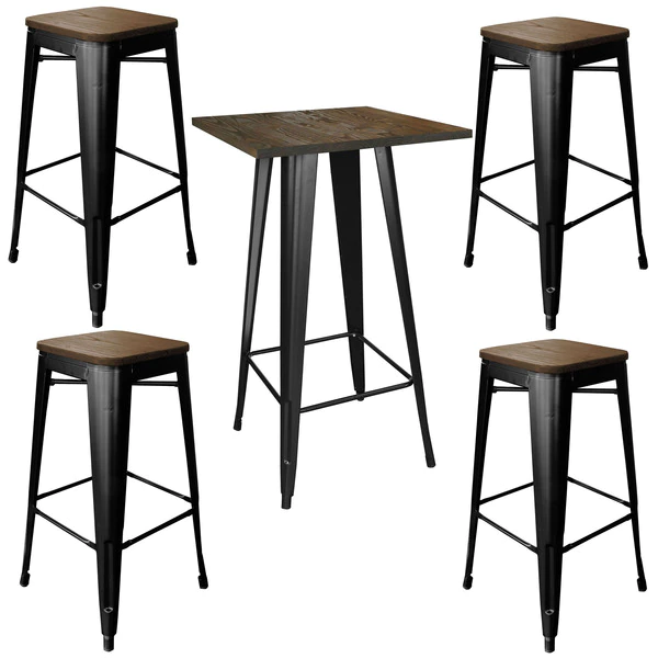 5 piece set includes one bar height table, and 4 bar stools. Dark elm wood seats and tabletop give this set an industrial, modern look. Metal construction with scratch-resistant powder coated paint finish, X-brace support for stability and durability. Solid Elm bar stool seat measures 12" L x 12.25" W, 30" H, 3/4" thick, 330 lbs weight limit, overall:17" W x 17" D x 30" H. Dark elm wood tabletop measures 23.5" x 23.5" square x 1" thick, overall: 23.5" W x 23.5" D x 41.5" H, weight capacity 200 lbs.
