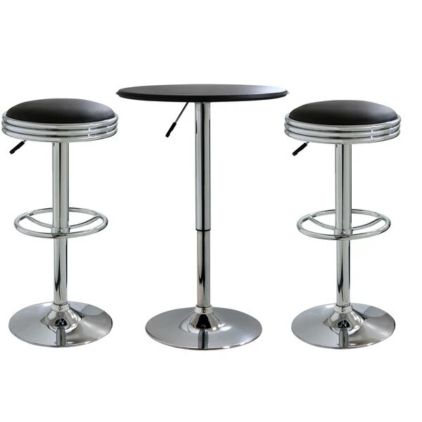 Includes 1 adjustable bar height table and 2 adjustable counter height bar stools. Makes a great addition to your kitchen, bar, game room, or basement. Vintage retro style. Bar stool specs: adjustable height from 22.5" to 30.25", 15.75" vinyl padded 360° swivel seat, 330 lbs. weight capacity each. Bar table specs: 25" diameter table top with textured vinyl covering, adjustable height from 26" to 36", 200 lbs. weight capacity.