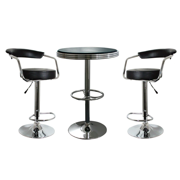 Includes 1 soda fountain style bar height table and 2 adjustable counter height bar stools. Classic retro style. Bar stool specs: adjustable height from 24.75" to 32.75", maximum seat back height 42.25", built in footrest, 14" , vinyl padded seat with padded back support, 330 lbs. weight capacity each. Bar table specs: 25" diameter table top with textured vinyl covering, adjustable height from 26.5" to 36.5", 200 lbs. weight capacity.