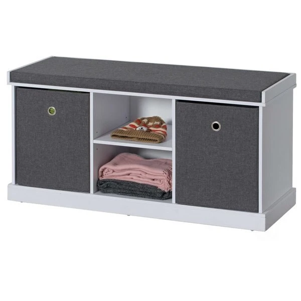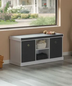 This Shoe Cubicle Storage Entryway Bench with Soft Cushion for Seating combines the comfort of a cushioned bench and cubby shoe storage for efficient use of the entryway. The storage bench has two and foldable baskets and drawers useful for storing both shoes and boots. Its Gray cushioned top serves as a comfy stool for when you need a seat. Welcome home.