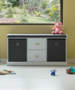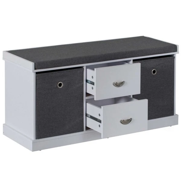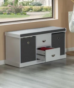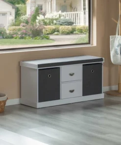 This Shoe Cubicle Storage Entryway Bench with Soft Cushion for Seating combines the comfort of a cushioned bench and cubby shoe storage for efficient use of the entryway. The storage bench has two and foldable baskets and shelves useful for storing both shoes and boots. Its Gray cushioned top serves as a comfy stool for when you need a seat. Welcome home.