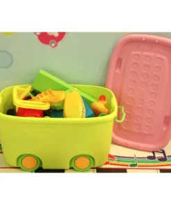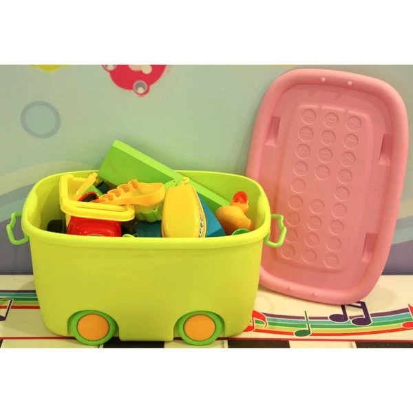 Stackable Toy Storage Box with Wheels is a great storage solution for any kids' bedroom or playroom. Handles and wheels allow you to easily move the toy box from room to room and a grooved lid allows multiple boxes to be stacked securely. It's playful colors will add cheer to your playroom and invite your kids to play.