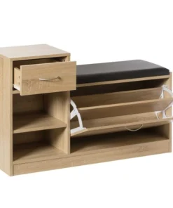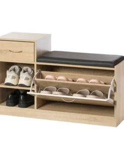 Organize your shoe collection with this shoe bench organizer. Designed with a hidden fold out rack, it provides storage for up to nine pairs of adult shoes. Additionally, the storage bench has 2 side open compartments and a drawer for extra storage. The shoe racks neatly fold closes, leaving only a sleek drawer exterior for display. Features various size compartments, useful for storing both shoes and boots. Its padded leather top serves as a comfy stool for when you need a seat. Welcome home.