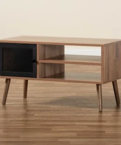 Rethink the layout of your living room with the bold design of the Yuna coffee table. Made in China, this stunning piece is comprised of a sturdy wood frame embellished with solid metal. One shelf behind the door provides a secure storage area, while two open shelves create a lovely display space. Requiring assembly, the Yuna features a mesh metal door for a cool, industrial touch. Angled legs complete the classic silhouette, making the Yuna coffee table an expressive addition to any space.