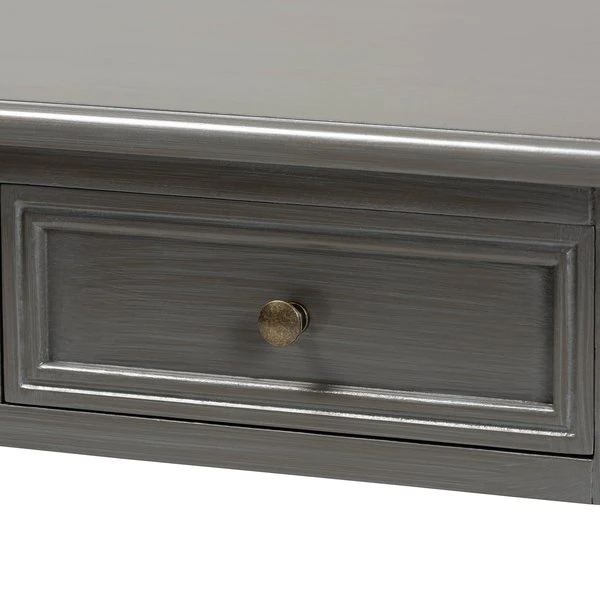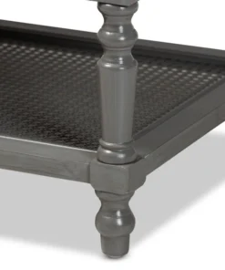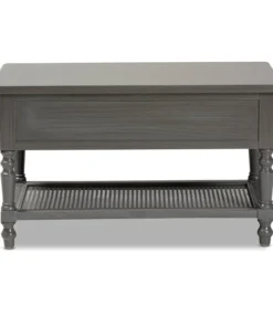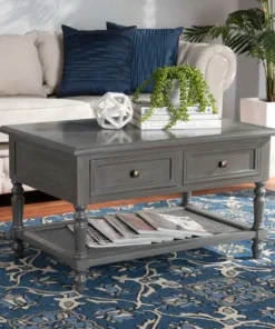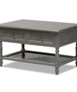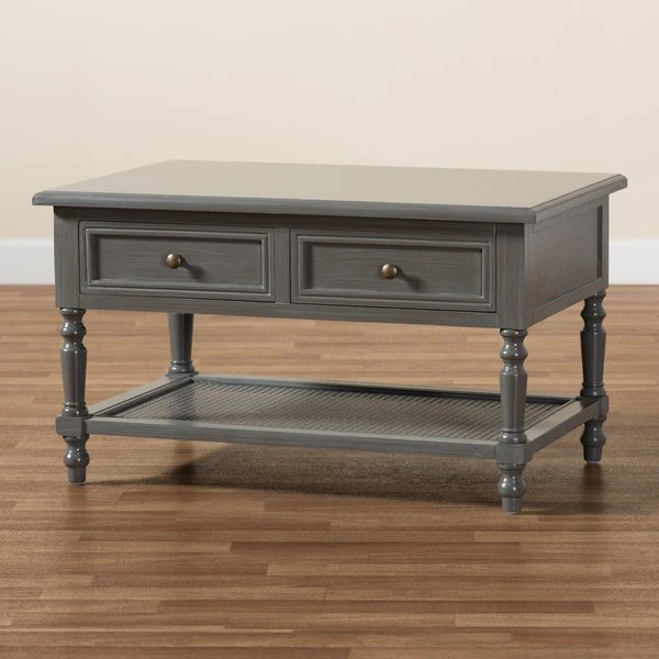 Arrange your living room around the timeless design of the Mahoney coffee table. Made in China, this table is crafted from sturdy wood with a neutral grey finish that blends well with modern spaces. Two drawers offer secure storage space, while the woven synthetic rattan shelf creates a convenient display for living room essentials. Requiring assembly, the Mahoney is supported by ring-turned legs for stable support that lend a sophisticated feel. Antique brass finished metal drawer knobs add a vintage touch, making the Mahoney coffee table a simple yet classy addition to any space.