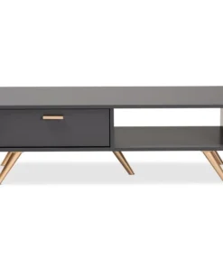 A tasteful expression of modern minimalism, the Kelson coffee table creates an impressive living room centerpiece. Made in Malaysia, the sturdy wood frame of the Kelson showcases a dark grey finish that exudes a cool, contemporary character. One spacious drawer keeps your living room essentials on hand, while the open shelf offers a convenient display for books and movies. Requiring assembly, the Kelson utilizes gold-tone angled legs for stable support with a luxurious touch. Gold handles add an eye-catching touch, making the Kelson coffee table a refreshing addition to any space.