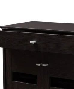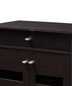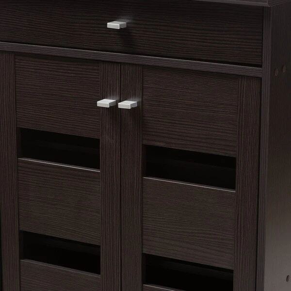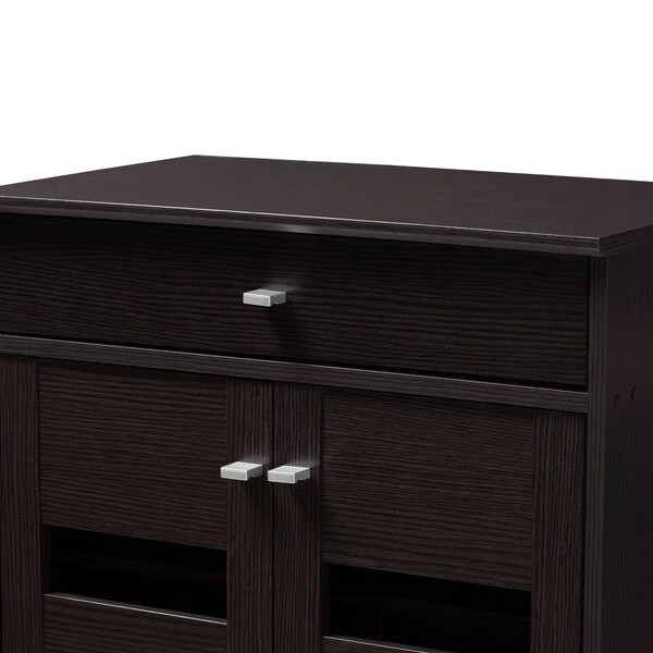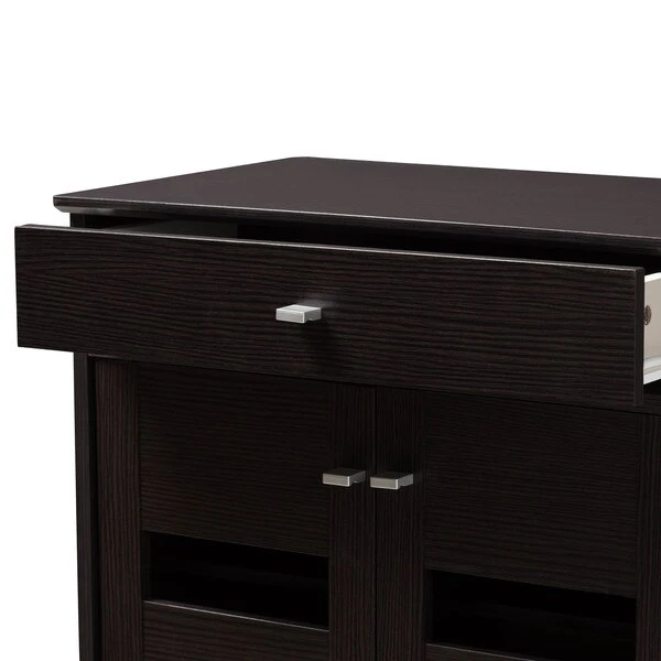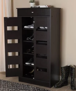 Keep your space tidy and stylish with the Acadia shoe cabinet. The modern and contemporary-inspired design is exemplified in this cabinet's straight, clean lines and tall silhouette. The Acadia is finished in a wenge brown with silver finished rectangular door handles. This tall shoe cabinet has one convenient top drawer that can serve as convenient place to put keys, mail, or serve as a catch-all drawer. The Acadia features five shelves discreetly placed behind two slatted doors, providing ventilation as a shoe rack and keeping clutter out of sight. This shoe cabinet provides plenty of storage space for shoes, purses, or anything else that needs tidying up to keep your entryway or mudroom organized. The Acadia requires assembly.