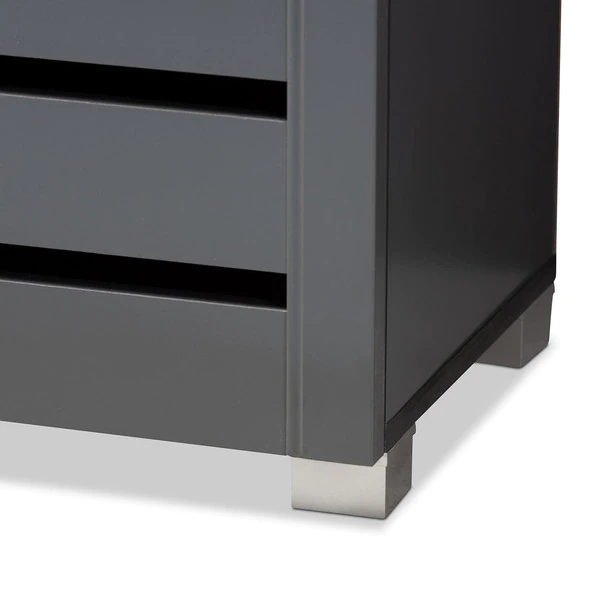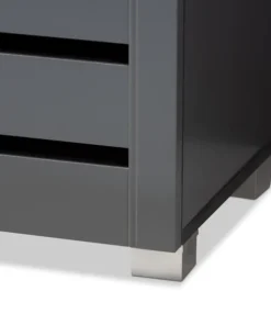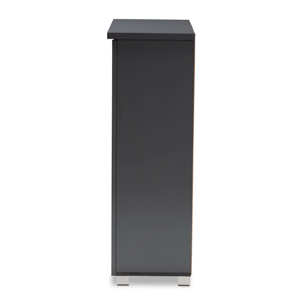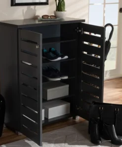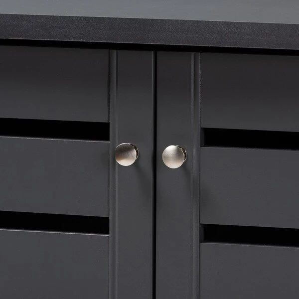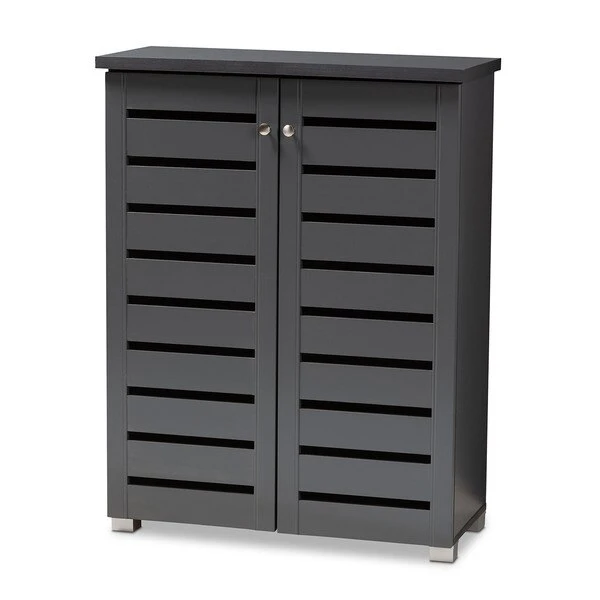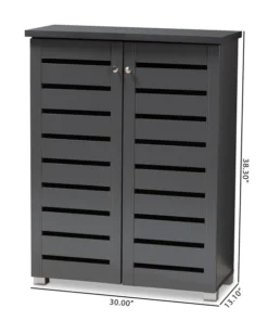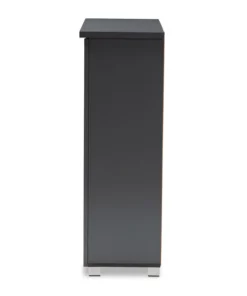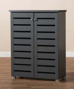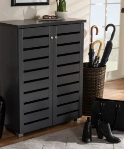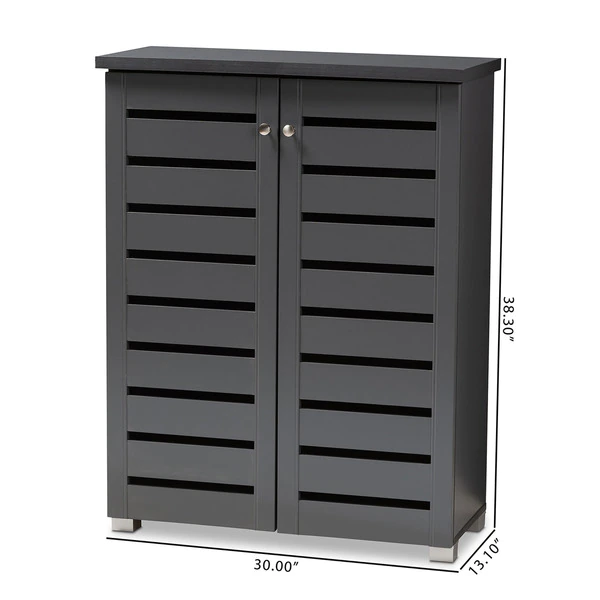 Shoe organization is made easy with the Adalwin cabinet. Featuring a stylish contemporary design and dark grey finish, the Adalwin is easy to coordinate with any style of decor. Two doors conceal four fixed shelves with storage space for up to 15 pairs of shoes. The doors feature open slats to enable air circulation and prevent mold growth on your shoes. The Adalwin cabinet requires assembly.