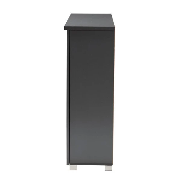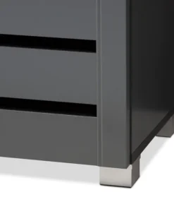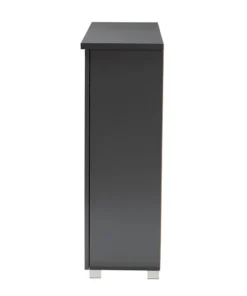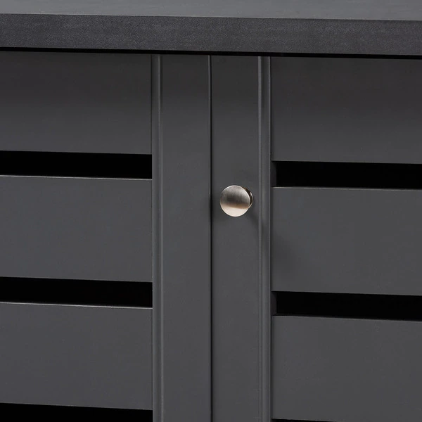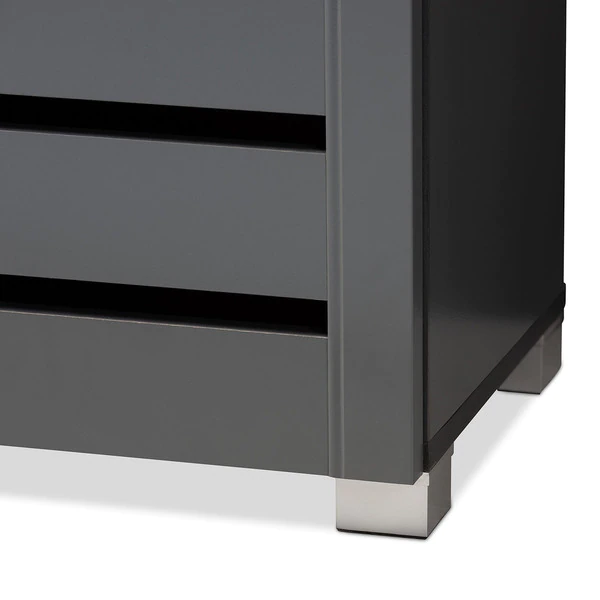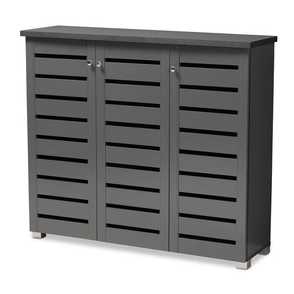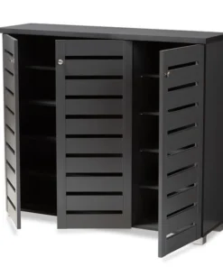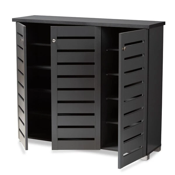 Shoe organization is made easy with the Adalwin cabinet. Featuring a stylish contemporary design and dark grey finish, the Adalwin is easy to coordinate with any style of decor. Three doors conceal eight fixed shelves with storage space for up to 20 pairs of shoes. The doors feature open slats to enable air circulation and prevent mold growth on your shoes. The Adalwin cabinet requires assembly.