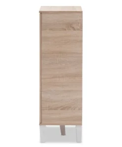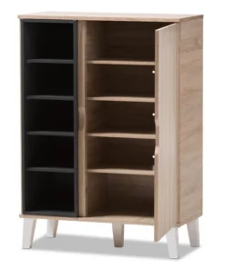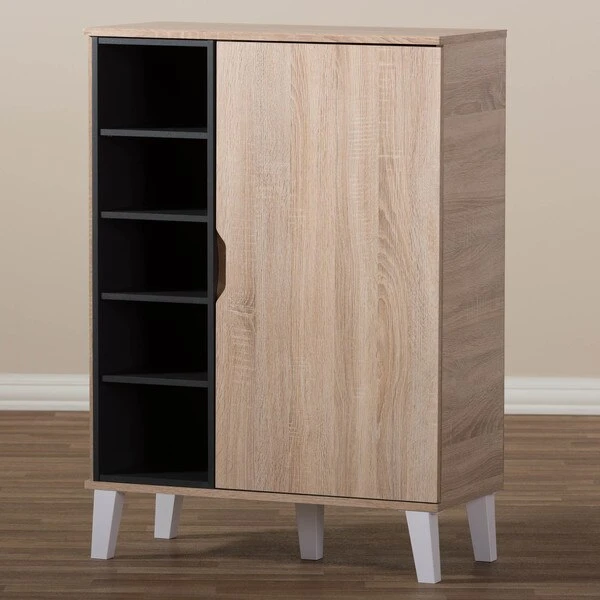 Opt for maximum storage space to organize your shoes with the ample shelving of the Adelina shoe cabinet. Constructed of engineered wood for a durable and sturdy structure that is easy to maintain, the Adelina features a generous amount of storage space, with five open shelves and five closed shelves behind the door to store and organize your shoes. Cabinet door is on metal hinges and with cut-out handle for easy access. A combination of oak and dark grey two-tone finishing imbues modern minimalism setting. The Adelina shoe cabinet requires assembly.