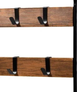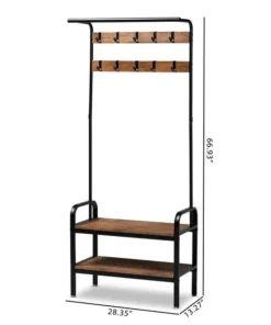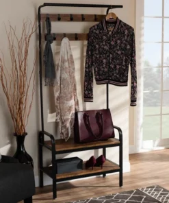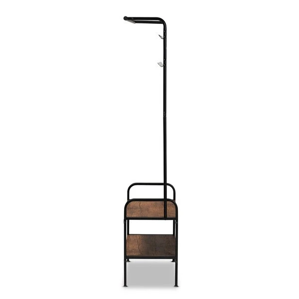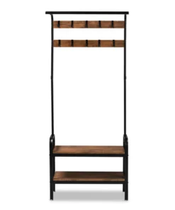 Add rustic style to your entryway with the Aislin hall tree. This versatile piece combines seating and storage into one, making it an ideal option for optimizing your space. A durable black metal frame supports two shelves crafted from distressed wood. Hang coats and scarves on ten hooks or on the top bar. Store shoes and bags on two shelves, one of which can also be used as a bench for putting on shoes. Functional and stylish, the Aislin features a clean industrial design that will complement any space. The Aislin hall tree requires assembly.