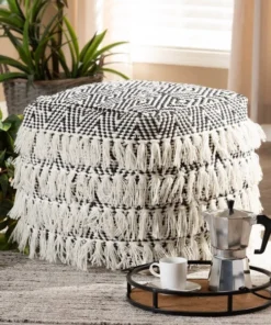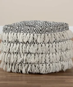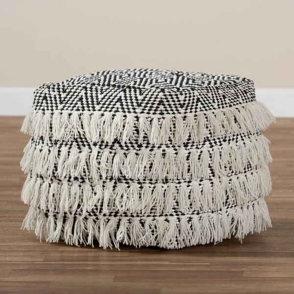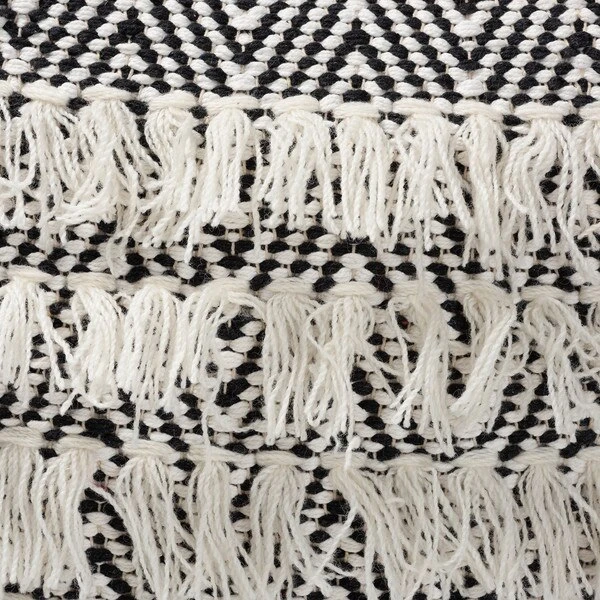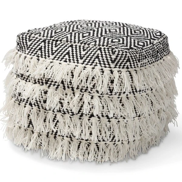 Add a cozy, bohemian touch to any space with the Alain pouf. Handwoven from cotton and wool, the Alain features a striking black and ivory diamond pattern. Rows of tassels along the sides lend a playful feel. This versatile piece can be used as a seat, footstool, or casual coffee table.