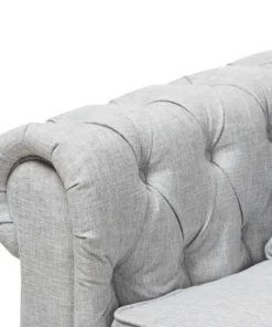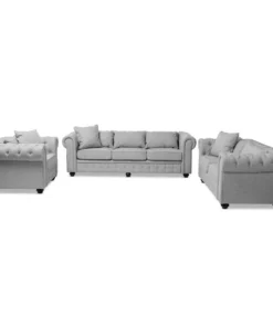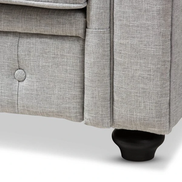 The low profile and plush rolled arms of the Alaise living room set are the epitome of sophistication. This modern and classic-inspired set is built to last with a wood frame and resting on dark brown finished bun feet. The Alaise is an updated take on the Chesterfield style with button tufting on the arms, back, and front panel. The chair back and arms are foam-padded and upholstered in gray fabric for optimum comfort. The cushions of each Alaise piece are removable. Full of gorgeous details, subtle fabric piping outlines the chair. The Alaise living room set includes a chair, loveseat, and sofa. Each piece comes with one matching pillow. Add class, style, and a cozy place to lounge to your living room or any shared space. The Alaise requires assembly.