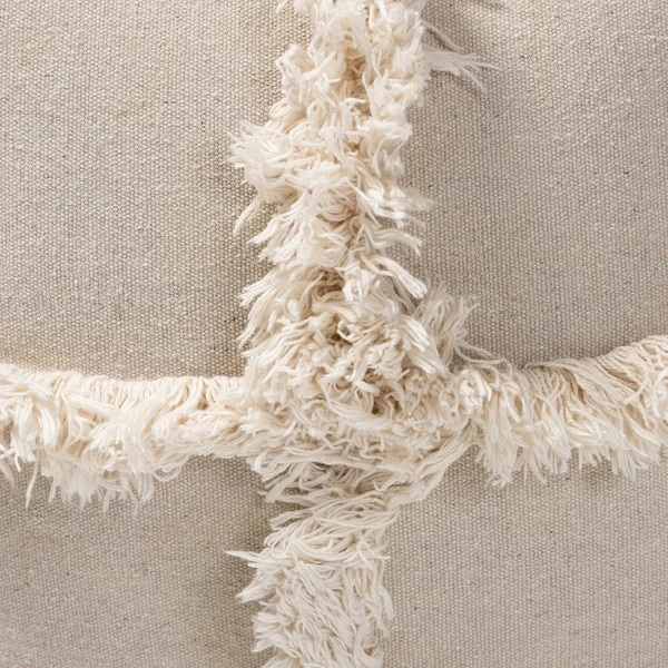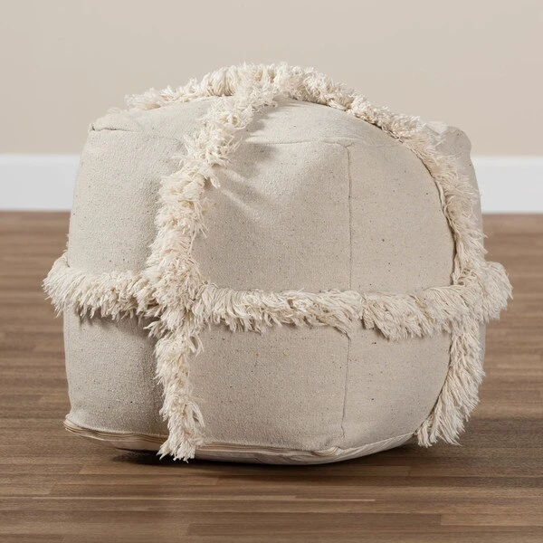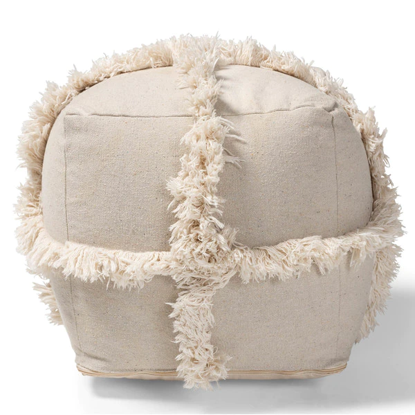 Add a cozy, bohemian touch to any space with the Alfro pouf. Handwoven from cotton, the Alfro features an understated beige hue. A criss-cross overlay of fringe lends a touch of texture. This versatile piece can be used as a seat, footstool, or casual coffee table.