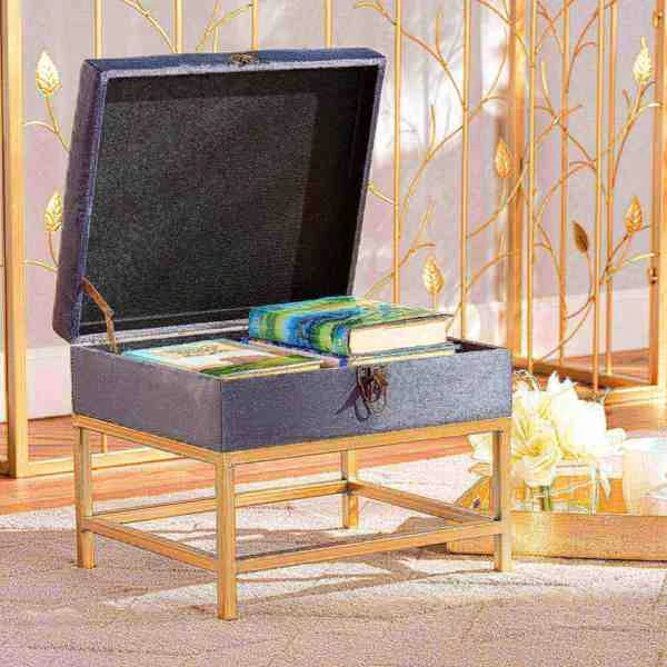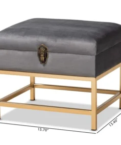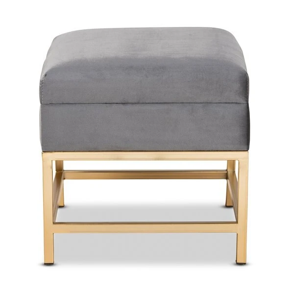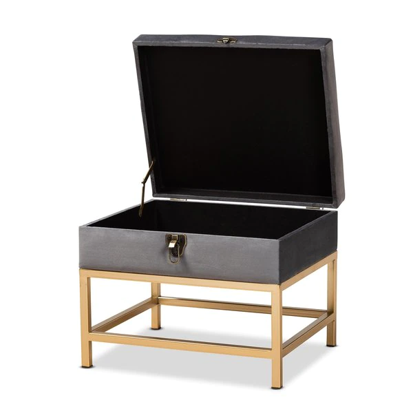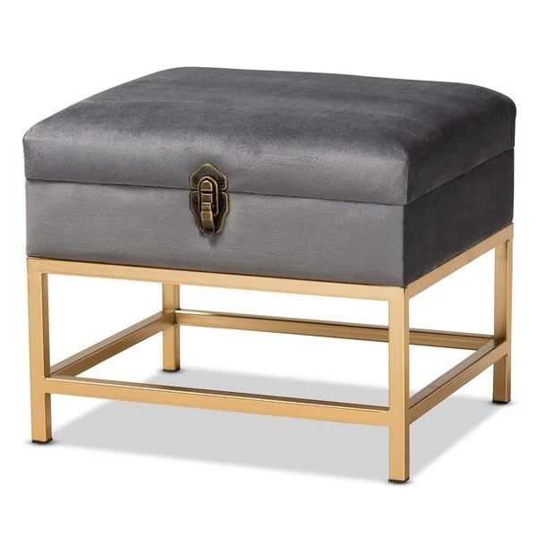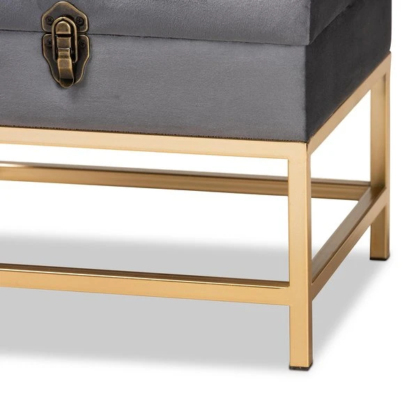 The luxurious storage and seating of the Aliana ottoman enriches any space with modern glamour. Made in China, the Aliana is comprised of a sturdy wood frame padded with soft foam and upholstered in smooth velvet fabric. Its seat lifts up to reveal plentiful storage space and is accented with an antique brass finished metal latch for a vintage touch. Fully assembled, the Aliana rests on gold finished metal legs for superb stability with an extravagant look. A deluxe combination of convenience and style, the Aliana ottoman is an excellent addition to the modern home.