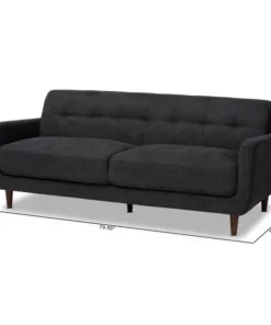 Cool retro style marries modern comfort in the Allister sofa. Constructed from sturdy wood, the Allister is upholstered in a chic grey fabric that complements the walnut brown finish on the legs. Wide, plush cushions and the slanted back provide ample seating comfort. Influenced by mid-century design, the Allister features biscuit tufting and tapered legs. Pair this sofa with the Allister loveseat to complete the look. The Allister sofa requires assembly.
