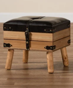 Give your space a hint of rustic flair with the charming Amena storage ottoman. Made in China, the Amena is comprised of horizontal wood panels showcasing a warm oak finish. The seat is padded with soft foam and upholstered in smooth PU leather for superb comfort when used as seating. Requiring assembly, its top lifts up to reveal ample storage space for blankets and more. A PU leather strap and brass finished metal studs lend a charming, vintage trunk inspired look. Angled legs complete the look, making the Amena storage ottoman a fantastic addition to the modern home.