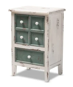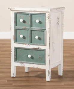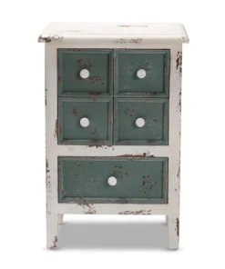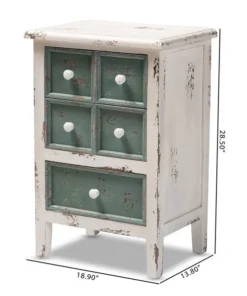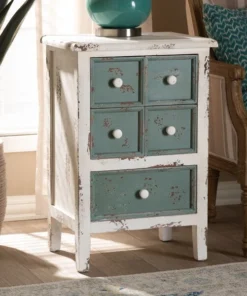 Featuring a worn finish, the Angeline chest is a charming addition to any space. This MDF wood chest features a distressed white and teal blue finish for a rustic antique appearance. Five drawers provide space to keep items organized and out of sight. Each drawer features a white-finished wood knob that complements the teal blue drawer front. Use this shabby chic chest as an end table in the living room or as an accent piece in the entryway. The Angeline chest will arrive fully assembled.