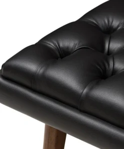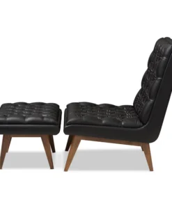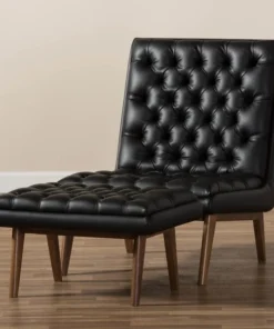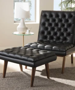 One look at the Annetha lounge chair and ottoman set is all you need to see that these stylish pieces are meant for comfort. This chair and ottoman's clean, square design and low-profile are mid-century modern-inspired. The Annetha is built to last with a solid rubberwood frame and angled walnut-finished legs. The seat, chair back and ottoman are foam-padded and upholstered in black faux-leather for optimum comfort. The Annetha features a generously sized seating area with a reclined back, perfect for lounging and relaxing – even better when you put your feet up on the matching ottoman. The sumptuous button-tufting makes this lounge chair and ottoman set a smart addition to your living room, waiting and reception areas, or any shared space. The Annetha requires assembly.