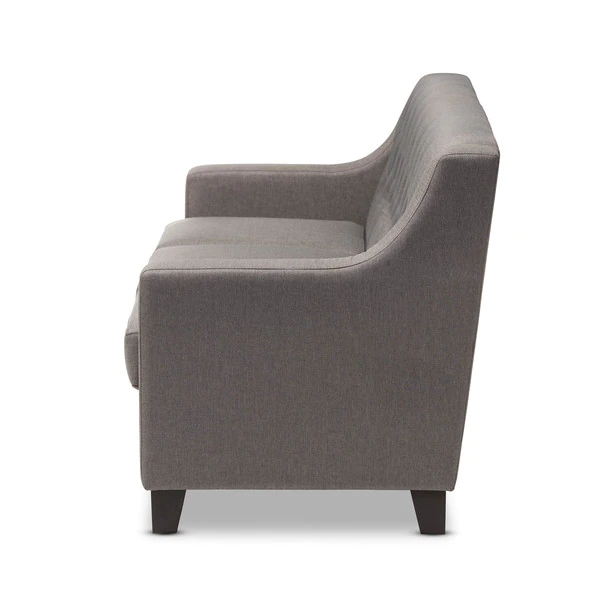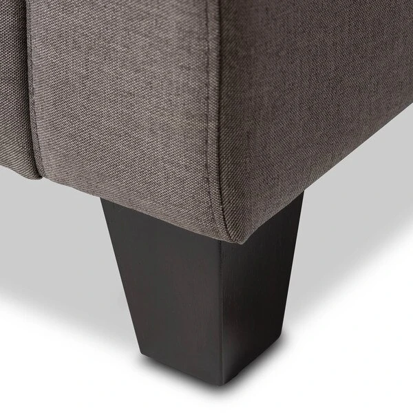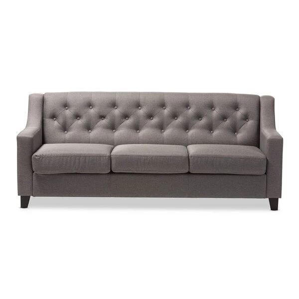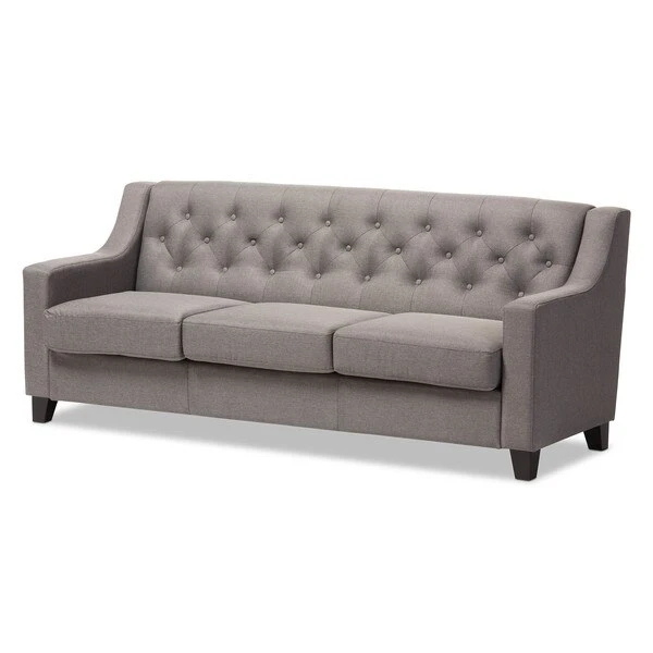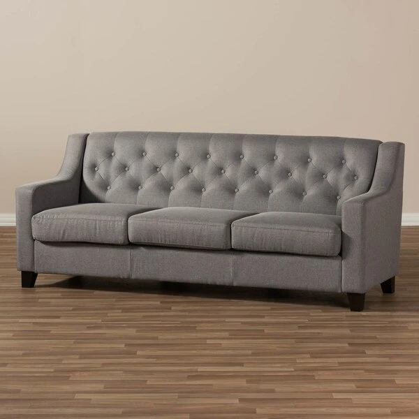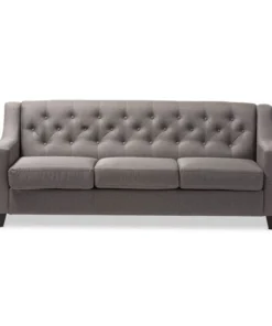 The Arcadia grey fabric upholstered living room 3-seater sofa blends classic buttons detailing with modern lines and contrast wooden legs. This quality 3-seater sofa has been expertly crafted from solid hardwood and upholstered with a smooth and inviting grey polyester fabric that is easy to care for and is soft to the touch. The Arcadia provides comfort with its foam filled cushioning and seat which sits on a supportive and sturdy sprung base. With sleek lines and sensuous curves, the arcadia will add flair to your living space. The Arcadia requires assembly.